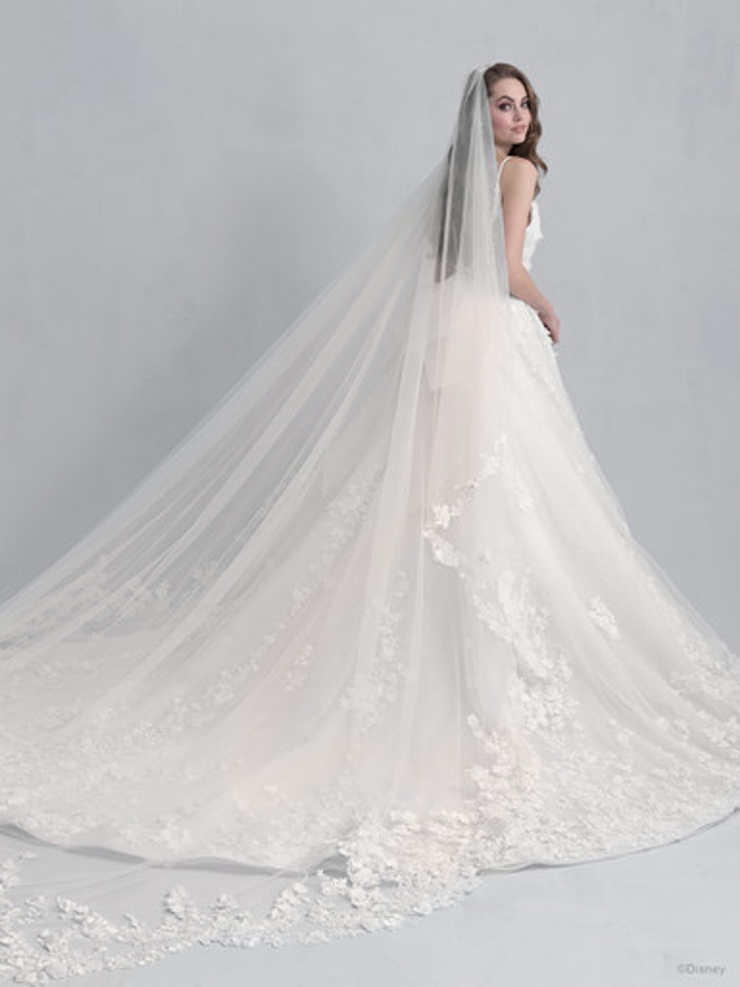 Capturing Snow White's grace and beauty, this Platinum ballgown features embroidered lace, seed beads, crystals and three-dimensional 'apple blossoms' scattered across sparkle tulle.