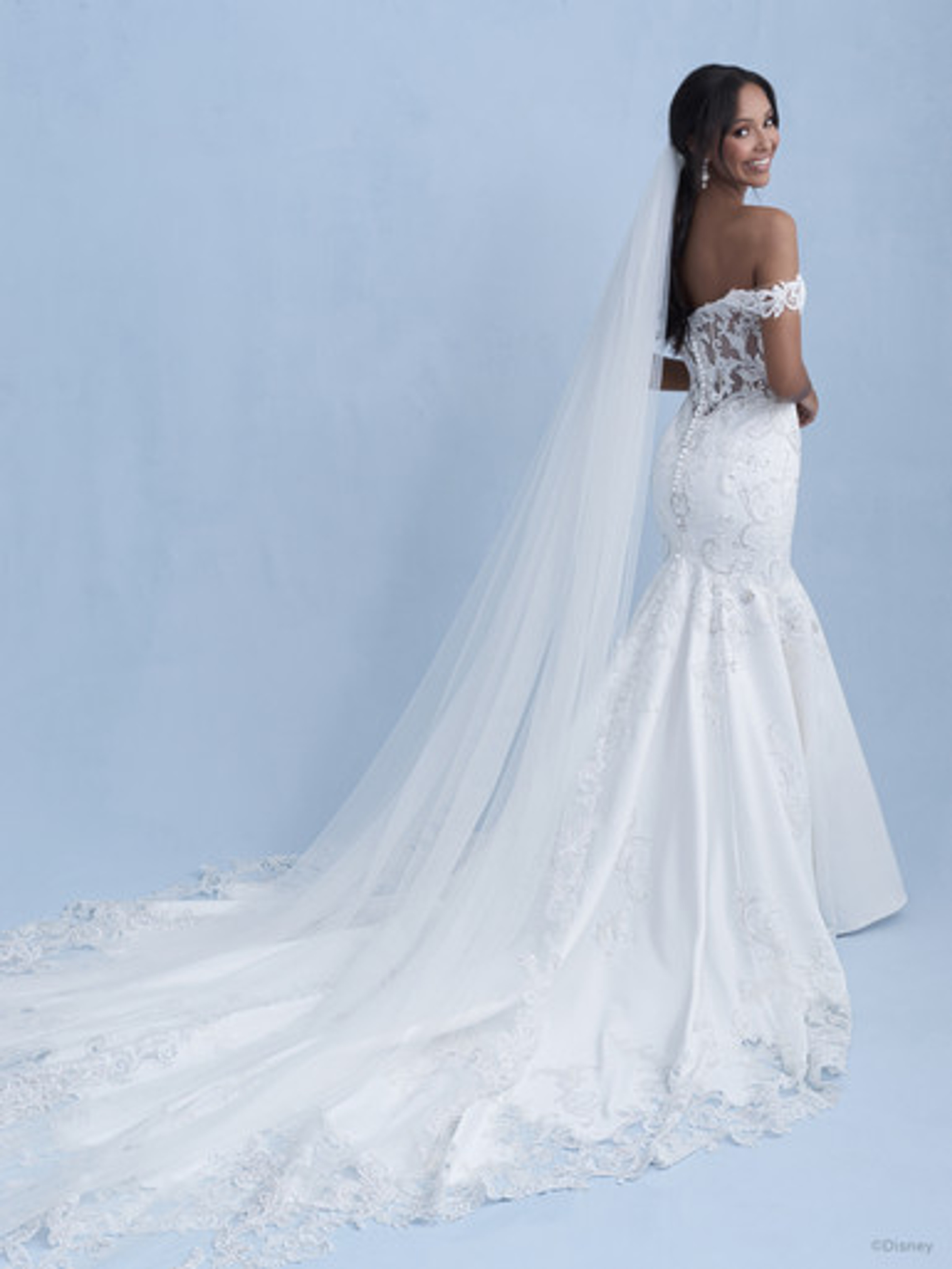 Inspired by Jasmine's bold and adventurous spirit, this elegant gown features beautiful detailing with crystal embroidery and an off the shoulder neckline.